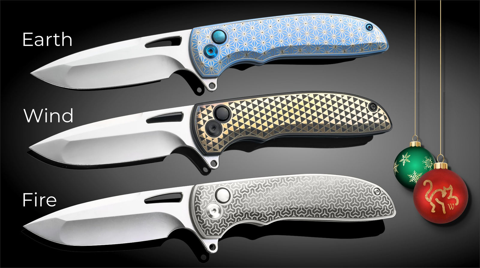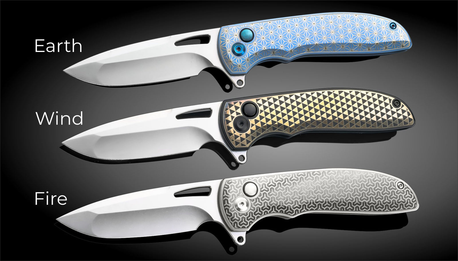 The CHI–FUU–KA series unites Earth, Wind, and Fire through traditional Japanese patterns, each symbolizing strength and vitality. From the grounded asanoha to the dynamic uroko and the bold, armor-inspired bishamonkikkō, these three knives form a harmonious trio that celebrates strength, motion, and bold resilience.