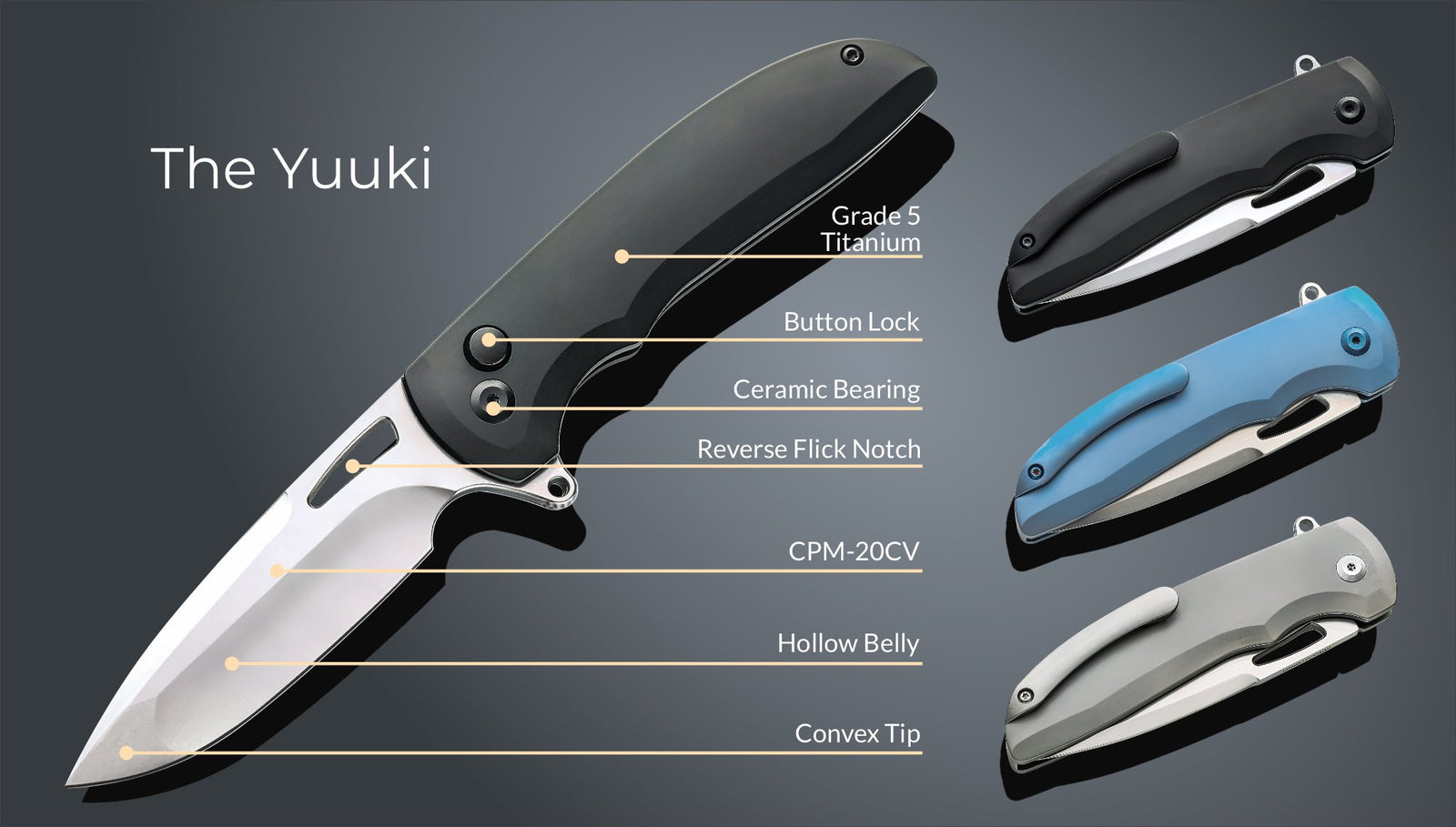 The Yuuki features a blade inspired by "Cormorant's Neck" Japanese swords. The gently contoured scales, chamfered edges, and long backspacer create a comfortable, premium feel in hand. The button lock, low-profile flipper, and ceramic bearings on the channeled raceway allows multiple smooth deployment methods.